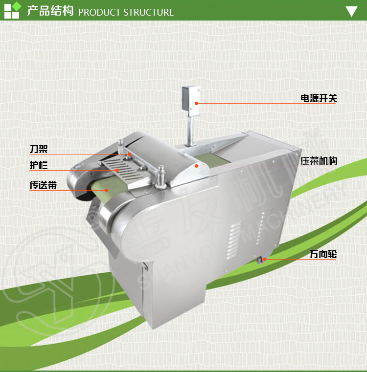 多用切菜机工作原理: 主要由机架,输送带,压菜带,切片机构,调速箱或塔轮调速机组成,用于瓜薯类硬菜的切片,片厚可在一定范围内自由调节,竖刀部分可将叶类软菜或切好的片加工成不同规格的块,丁,菱形等各种形状。切菜长度通过“可调偏心轮”在一定范围内任意调整。因竖刀模拟手工切菜原理,加工表面平整光滑,成型规则,被切蔬菜组织完好,保持新鲜。