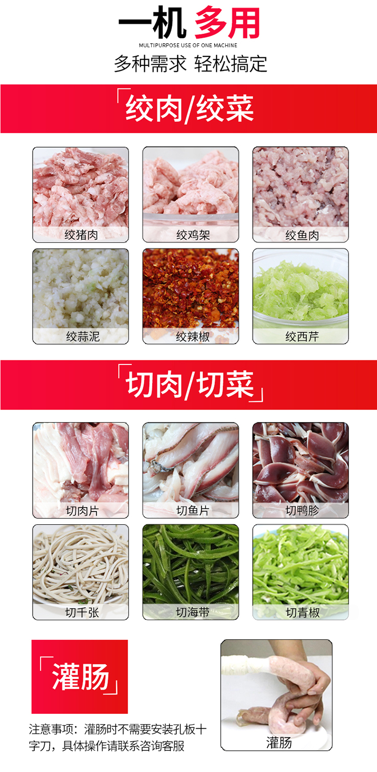 绞切两用机切肉、绞肉两大功能集于一身,具备切肉机和绞肉机各自的特点。